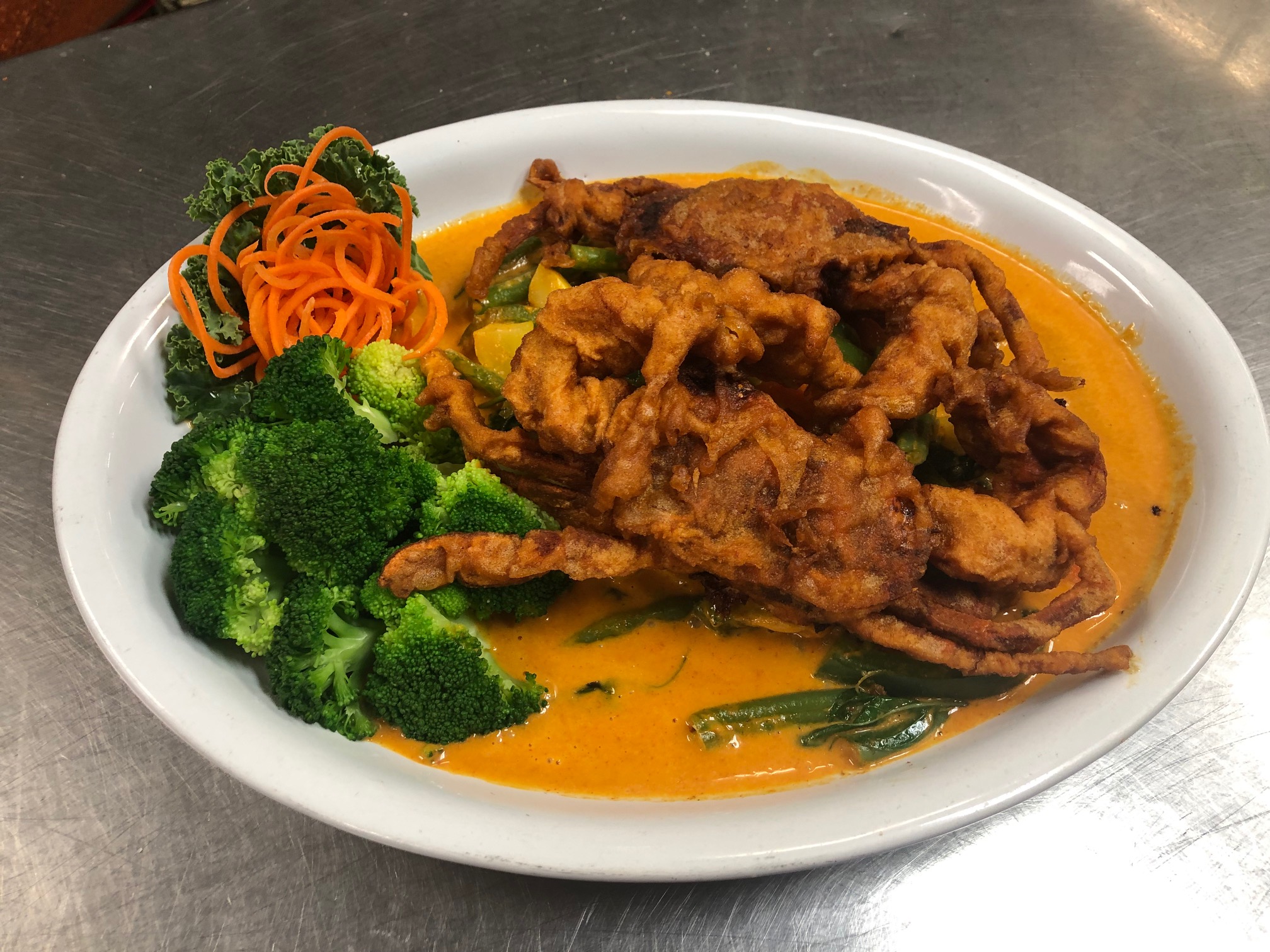 Softshell crab tempura (2), prepared with your choice of ANY stir Fried Sauce or Curry.