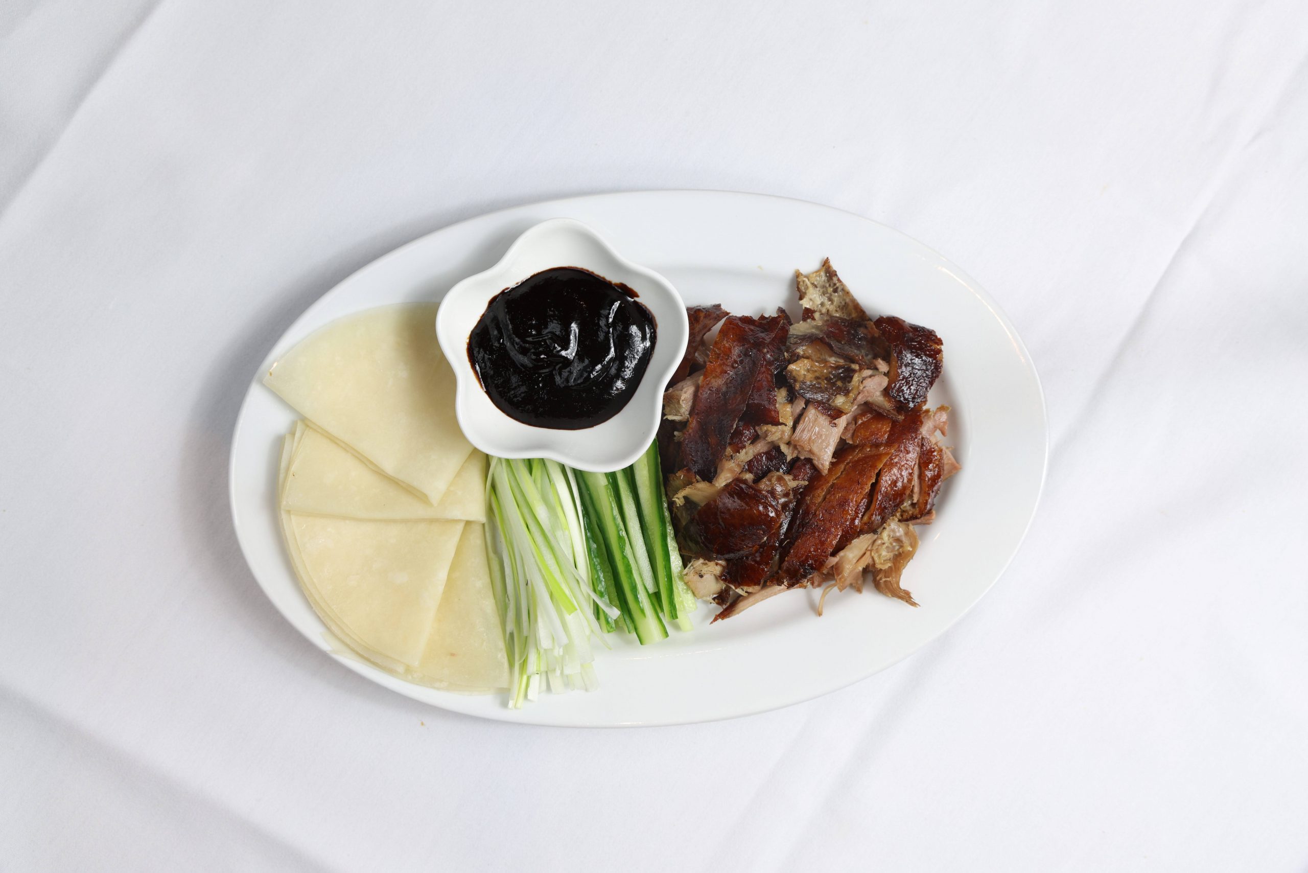 Boneless duck meat with scallion and hoisin sauce wrapped in 4 Chinese pancakes