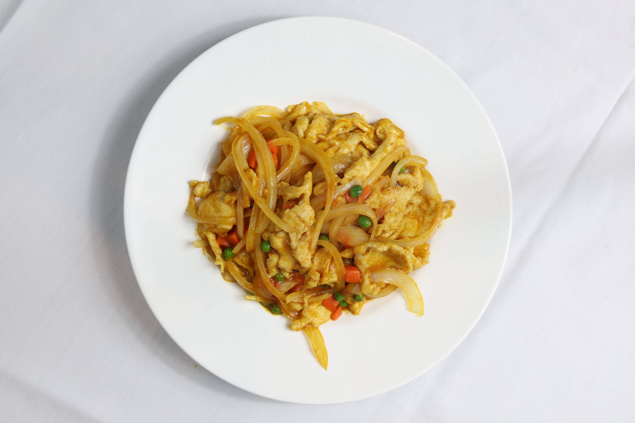 Onions, green peas & carrots in spicy yellow curry sauce