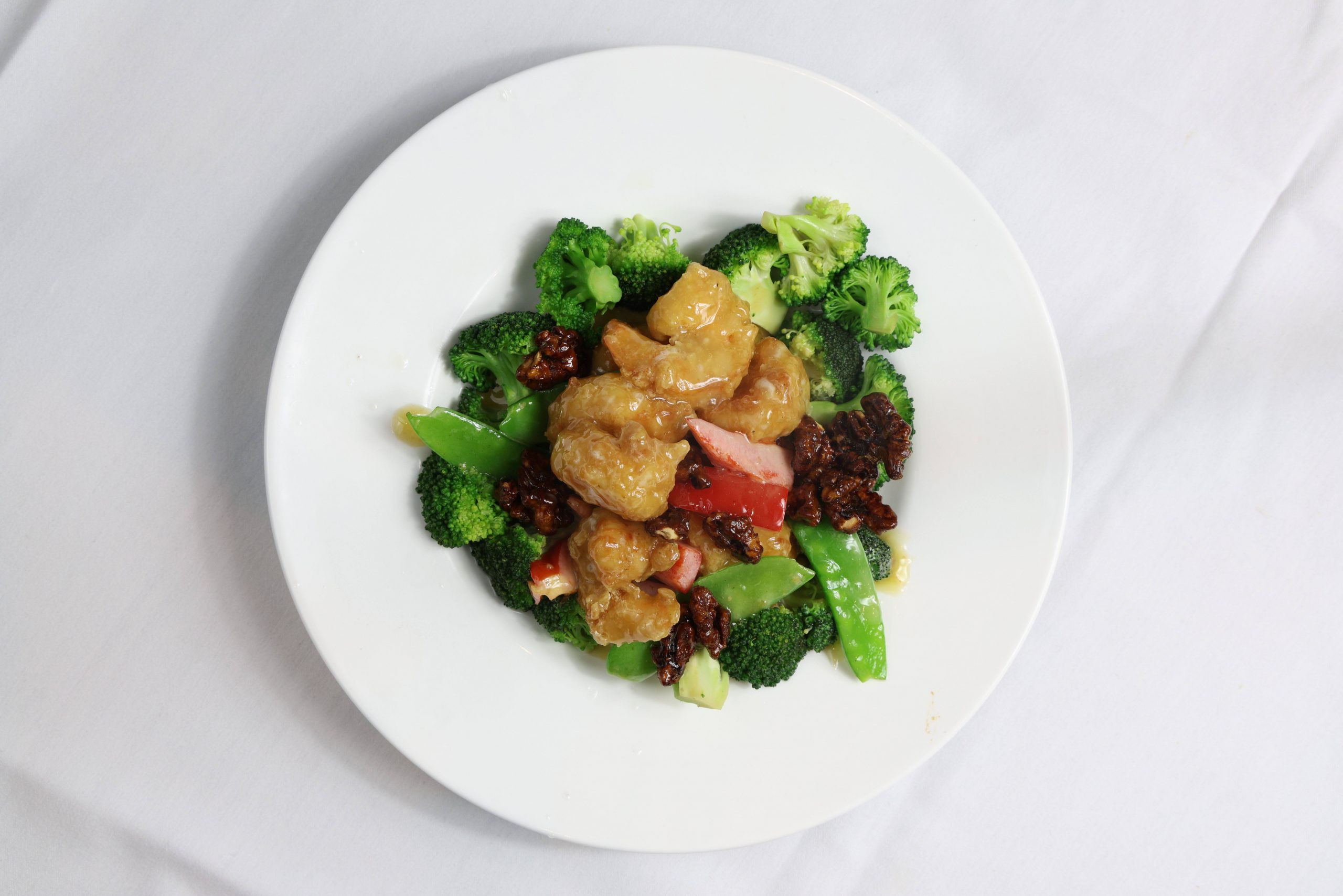 Walnut, red bell pepper and broccoli in homemade Chinese special sauce