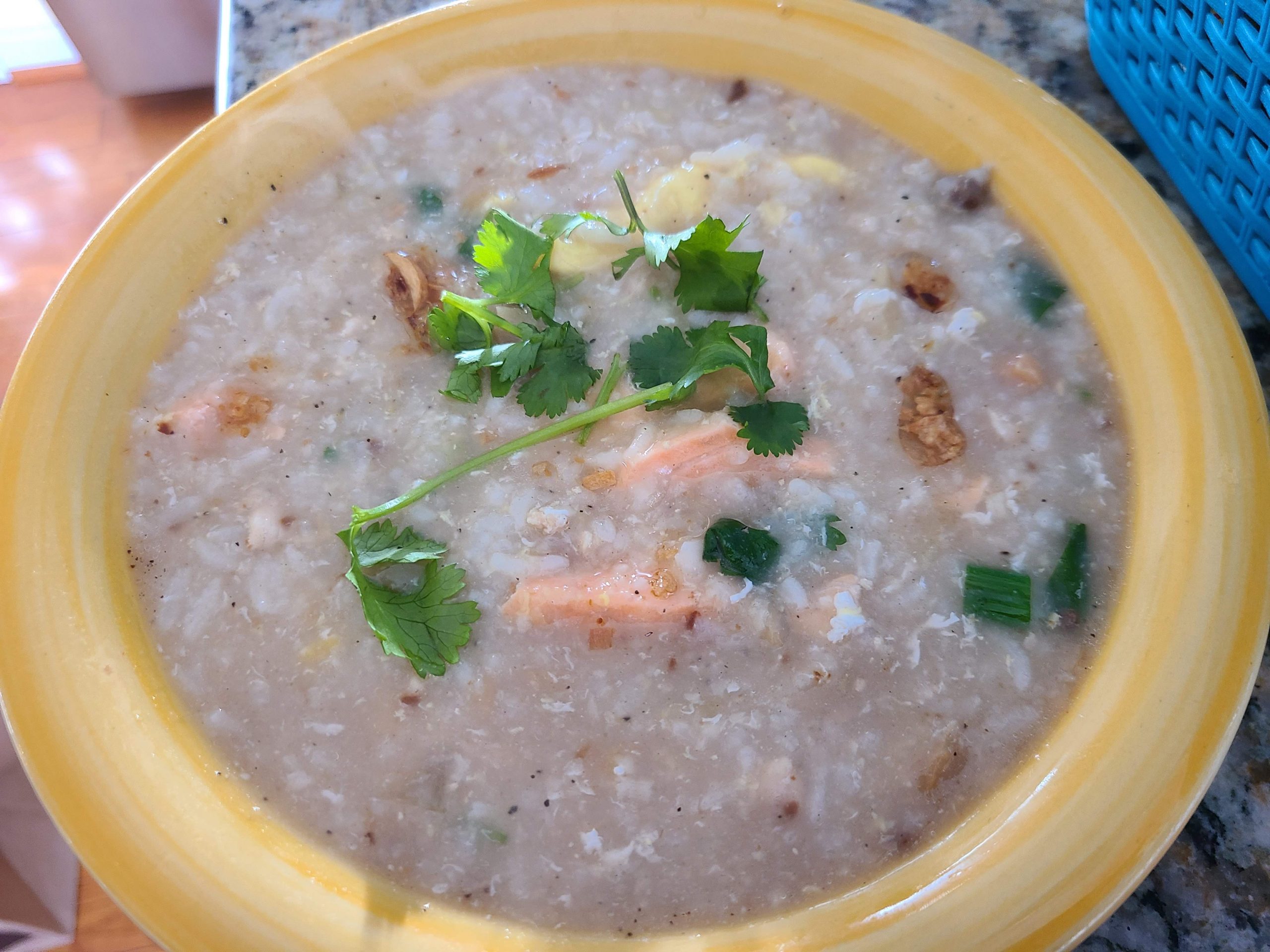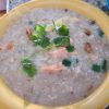 Ground chicken, rice, ginger, onions, celery, peas, and carrot cilantro and fried garlic in chicken broth.