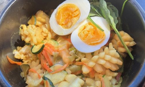 Pan-fried tofu with ramen noodles over rice and vegetables