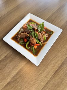Tender crispy duck breast with our family’s spicy basil recipe, stir-fried with green beans, bell peppers, carrots, and onions, then topped with fragrant crispy Thai basil. A perfect balance of heat and tradition!!