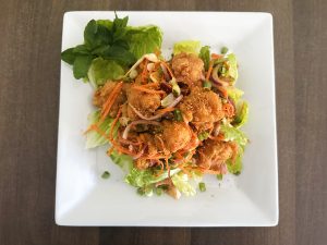 A vibrant take on Thai street flavors, our Gai Zapp features crispy fried chicken coated in a house larb seasoning with a bold balance of spice and citrus. Finished with fresh herbs, red onion, green onion, and carrots, and served on a bed of crisp lettuce with a side of rice. Spice level: Medium or higher (cannot be made mild)
