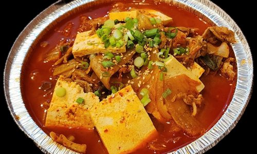 (NEW ITEM) A rich and Spicy Korean Stew simmered with kimchi, pork, soft tofu and vegetables. Served with steamed rice and seaweed.on the side.